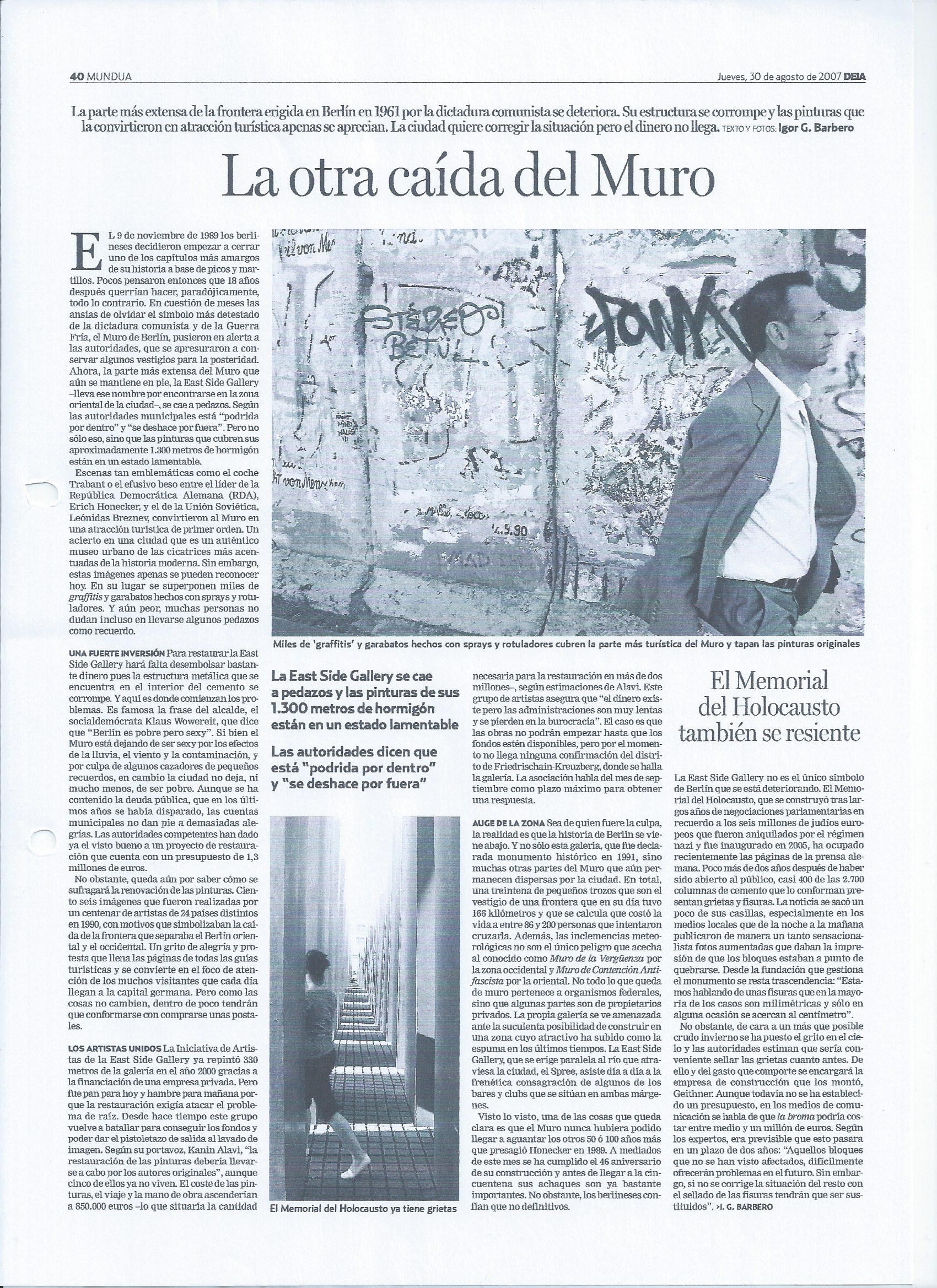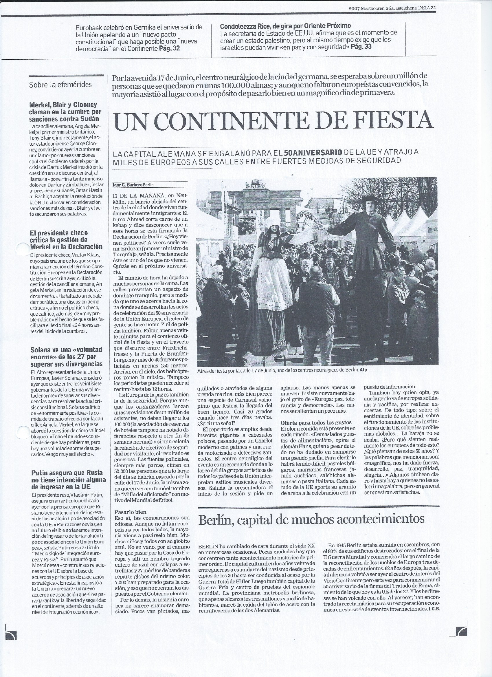 Tuve mi sede en Berlín entre finales de 2006 y principios de 2008. En esta etapa colaboré principalmente para el diario vasco DEIA cubriendo la actualidad alemana desde Berlín y algunos acontecimientos en países centroeuropeos. Entre mis coberturas más destacadas figuran la cumbre del G8 o la celebración del 25 aniversario de la Unión Europea en suelo teutón. También publiqué algunos artículos en otros medios como GARA o el diario alemán Junge Welt. Bajo estas líneas se ofrece una pequeña selección de los artículos que vieron luz durante ese tiempo: