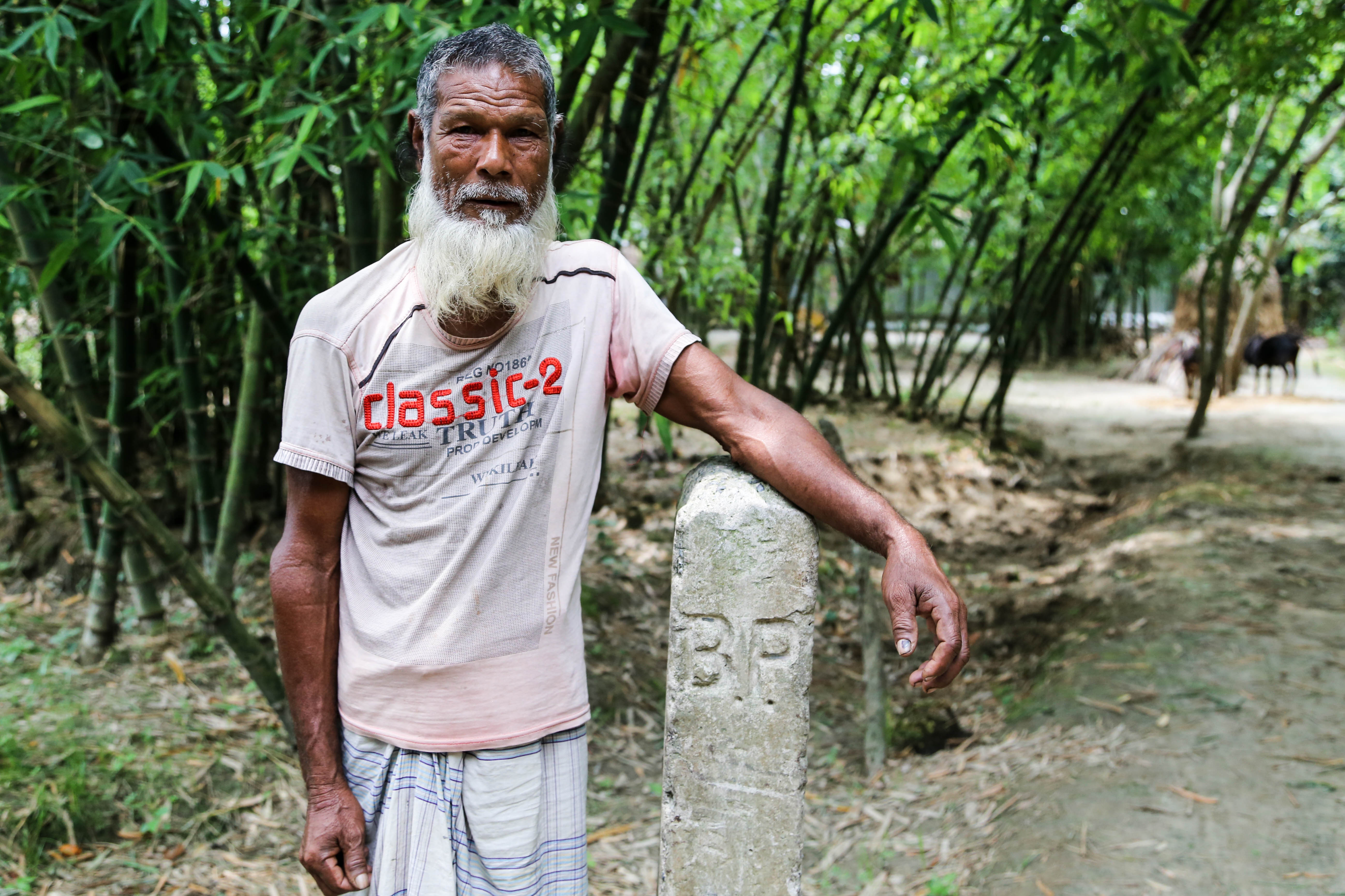 El septuagenario Ansar Ali posa su brazo sobre el poste que marca el comienzo del enclave indio de Bashkata, situado en el distrito bangladesí de Lalmonirhat. Ali es uno de los líderes de Bashkata.