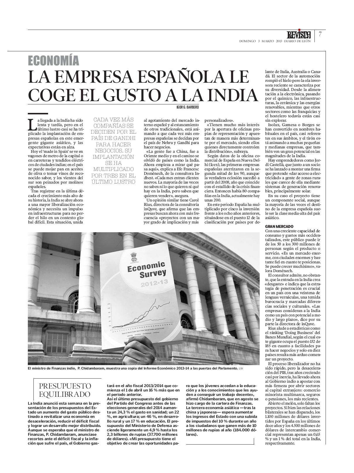Nueva Delhi, 3 de marzo de 2013.- La llegada a la India ha sido lenta y tardía, pero en el último lustro casi se ha triplicado la implantación de empresas españolas en este emergente gigante asiático, y las expectativas están en alza. Hoy el ‘made in Spain’ se ve en vagones de metro de la capital o en carreteras y tendidos eléctricos de ciudades indias; en el país se puede mojar pan en aceites de oliva o tomar vinos de reconocido sabor, y los vientos del sur son peinados por molinos españoles.