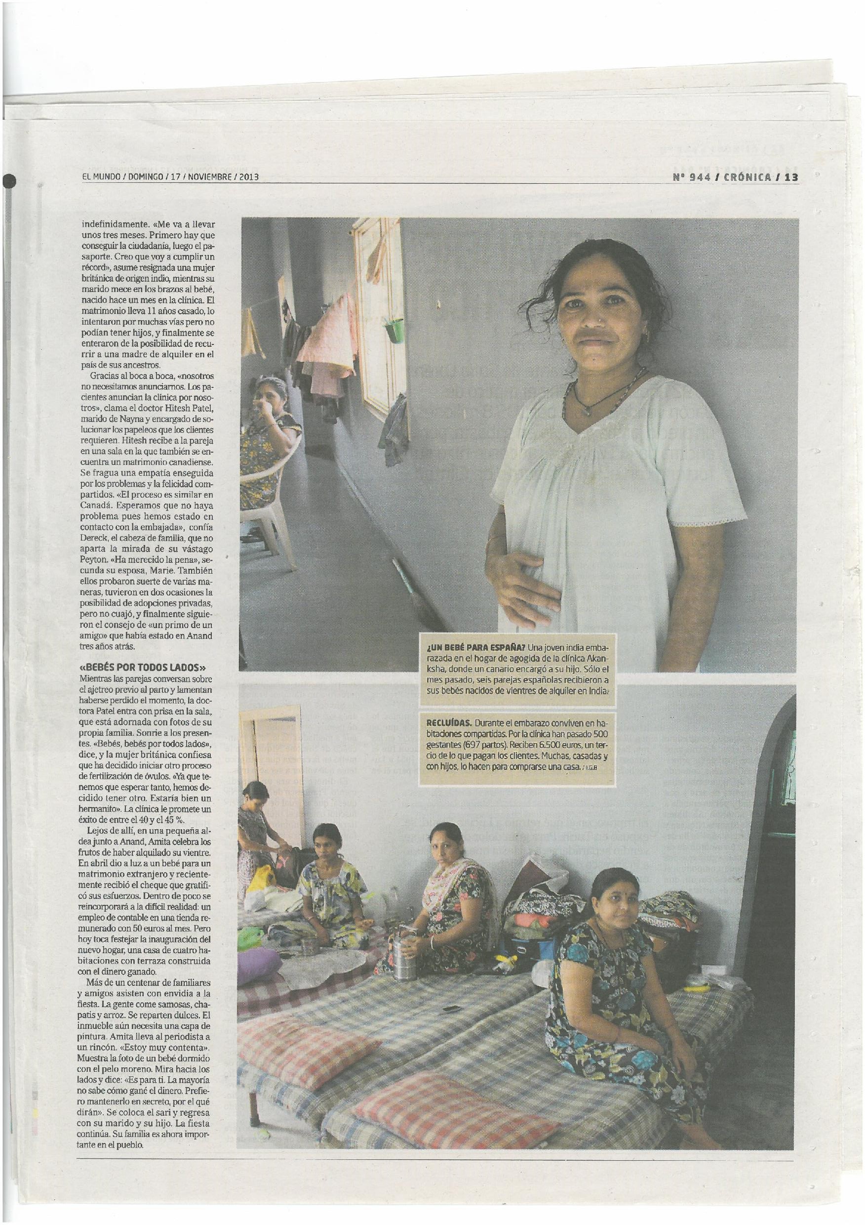 Noviembre de 2013.- La joven Manjuca, de 31 años, espera sentada en el salón. En la pared hay una foto de un bebé blanquito sonriente y un gran calendario en el que los días que pasan son tachados rigurosamente. Ella los cuenta. Hace dos semana le transfirieron el embrión de un matrimonio de Londres y en 15 días sabrá si está embarazada. Manjuca es una madre de alquiler. Si tiene éxito se quedará en el hogar de acogida durante nueve meses. No está sola. Más de 60 mujeres conviven en habitaciones de entre cuatro y seis camas. Algunas dormitan, otras hacen punto o ven la televisión. Siguen una dieta estricta. A todas les une un origen humilde y todas afrontan el mismo destino: son madres de alquiler. Darán a la luz a niños que serán criados por otras familias,