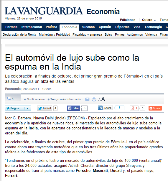 Nueva Delhi, 26 de agosto de 2011.- Espoleado por el alto crecimiento de la economía y la aparición de nuevos ricos, el mercado de los automóviles de lujo sube como la espuma en la India, con la apertura de concesionarios y la llegada de marcas y modelos a la orden del día.La celebración, a finales de octubre, del primer gran premio de Fórmula-1 en el país asiático corona ahora una trayectoria meteórica que en los tres últimos años ha proporcionado grandes réditos a los fabricantes de este tipo de automóviles.
