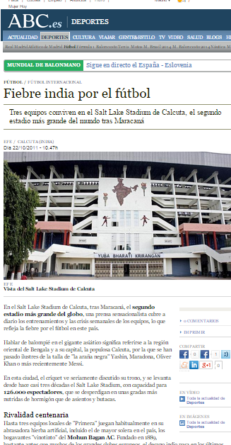 Calcuta, 22 octubre de 2011.- En el Salt Lake Stadium de Calcuta, tras Maracaná, el segundo estadio más grande del globo, una prensa sensacionalista cubre a diario los entrenamientos y las crisis semanales de los equipos, lo que refleja la fiebre por el fútbol en este país