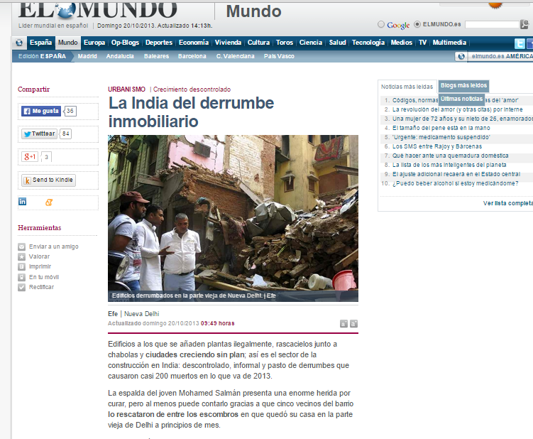 Nueva Delhi, 20 de octubre de 2013.- Edificios a los que se añaden plantas ilegalmente, rascacielos junto a chabolas y ciudades creciendo sin plan; así es el sector de la construcción en India: descontrolado, informal y pasto de derrumbes que causaron casi 200 muertos en lo que va de 2013.