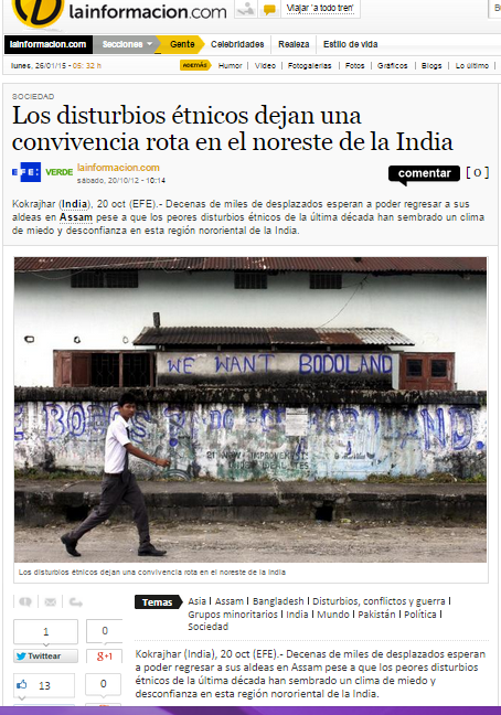 Kokrajhar (India), 20 de octubre de 2012.- Decenas de miles de desplazados esperan a poder regresar a sus aldeas en Assam pese a que los peores disturbios étnicos de la última década han sembrado un clima de miedo y desconfianza en esta región nororiental de la India. «Un grupo de rebeldes musulmanes atacó nuestra aldea por la noche y tuvimos que huir. Lo hemos perdido todo», se lamenta Monica Brahma, una mujer de la etnia local bodo que desde hace casi tres meses vive en un campamento de acogida con sus dos hijos pequeños.