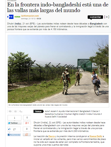 Dhubri (India), 21 de octubre de 2012.- Las autoridades indias rodean desde hace décadas a Bangladesh con una de las mayores verjas del planeta para frenar el contrabando y la inmigración ilegal a través de una porosa frontera que se extiende por más de 4.150 kilómetros. La inacción de Dacca y la presión interna condujeron a Nueva Delhi a iniciar el vallado en los ochenta, pero tras varios vencimientos de plazo no ha sido aún capaz de sellar por completo la frontera terrestre, que supone unos tres cuartos del total.