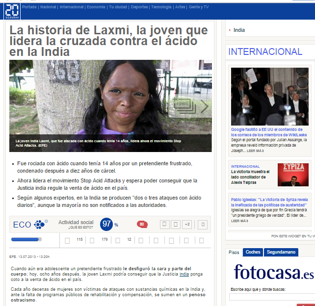Nueva Delhi, 13 de julio de 2013.- Cuando aún era adolescente un pretendiente frustrado le desfiguró la cara y parte del cuerpo; hoy, ocho años después, la joven Laxmi podría conseguir que la Justicia india ponga coto a la venta de ácido en el país.