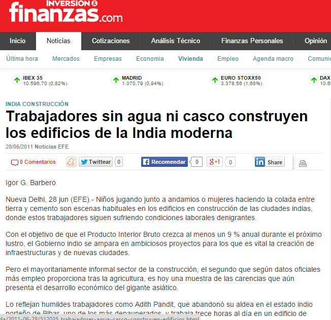 Nueva Delhi, 28 de junio de 2011.- Niños jugando junto a andamios o mujeres haciendo la colada entre tierra y cemento son escenas habituales en los edificios en construcción de las ciudades indias, donde estos trabajadores siguen sufriendo condiciones laborales denigrantes. Con el objetivo de que el Producto Interior Bruto crezca al menos un 9 % anual durante el próximo lustro, el Gobierno indio se ampara en ambiciosos proyectos para los que es vital la creación de infraestructuras y de nuevas ciudades.