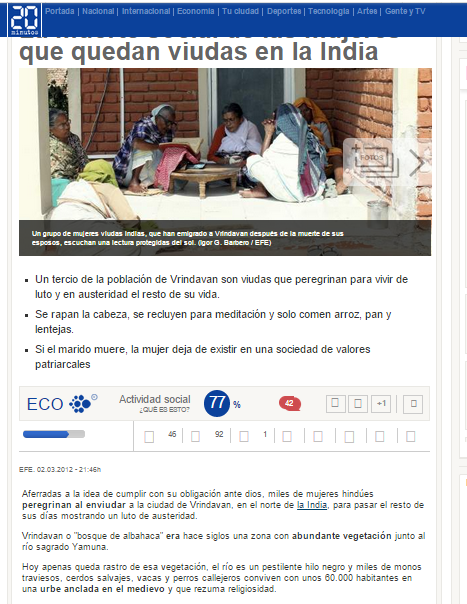Vrindavan (India), 1 de marzo de 2012.- Aferradas a la idea de cumplir con su obligación ante dios, miles de mujeres hindúes peregrinan al enviudar a la ciudad de Vrindavan, en el norte de la India, para pasar el resto de sus días mostrando un luto de austeridad. Vrindavan o «bosque de albahaca» era hace siglos una zona con abundante vegetación junto al río sagrado Yamuna.
